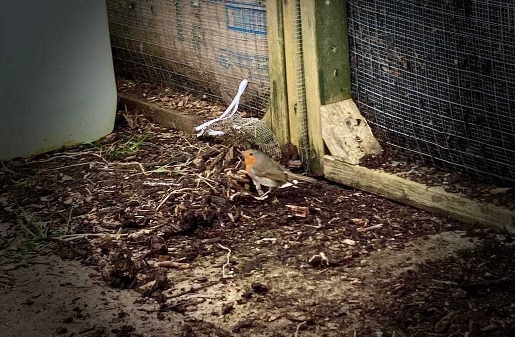 This is now cooked and needs to rest at a cooler temperature while the worms and other critters process it further, so I turned it into the middle resting bay to free up the hexagon for the next batch. As I did so I was visited by not one but two robins. Sadly the second one flew off as I lifted my phone for a photo.