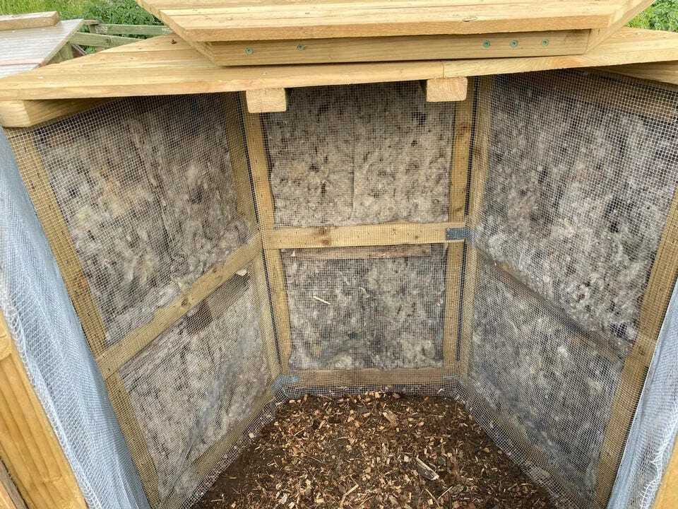 In short, it all kinda worked? I was pleased to see that aside from some tugging through the slats by rodents the wool was intact and mostly dry. Heat-wise, the rounder shape certainly did the business giving a much more even ‘bake’, but the summer sun dried out the south-facing side meaning when I came to turn it in August the left and middle was nice and dark while the right was barely touched. Still, that’s a positioning problem which shouldn’t be an issue now we’re moving into winter. Next spring I’ll move it or build a shade.